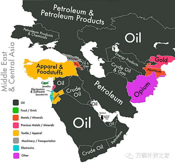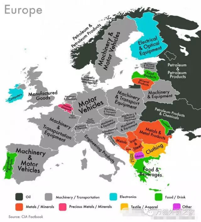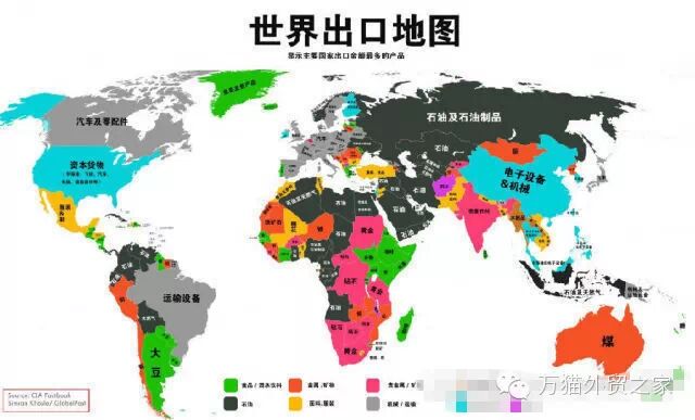 看图可知,中东和俄罗斯大发石油财,非洲除了石油还盛产贵重金属和钻石,南美成世界食物出口大洲,北美和东亚大量出口电子产品,欧洲的强项则是汽车和机械产品。这些看似寻常的出口品构成了一个个国家的主要外贸收益。